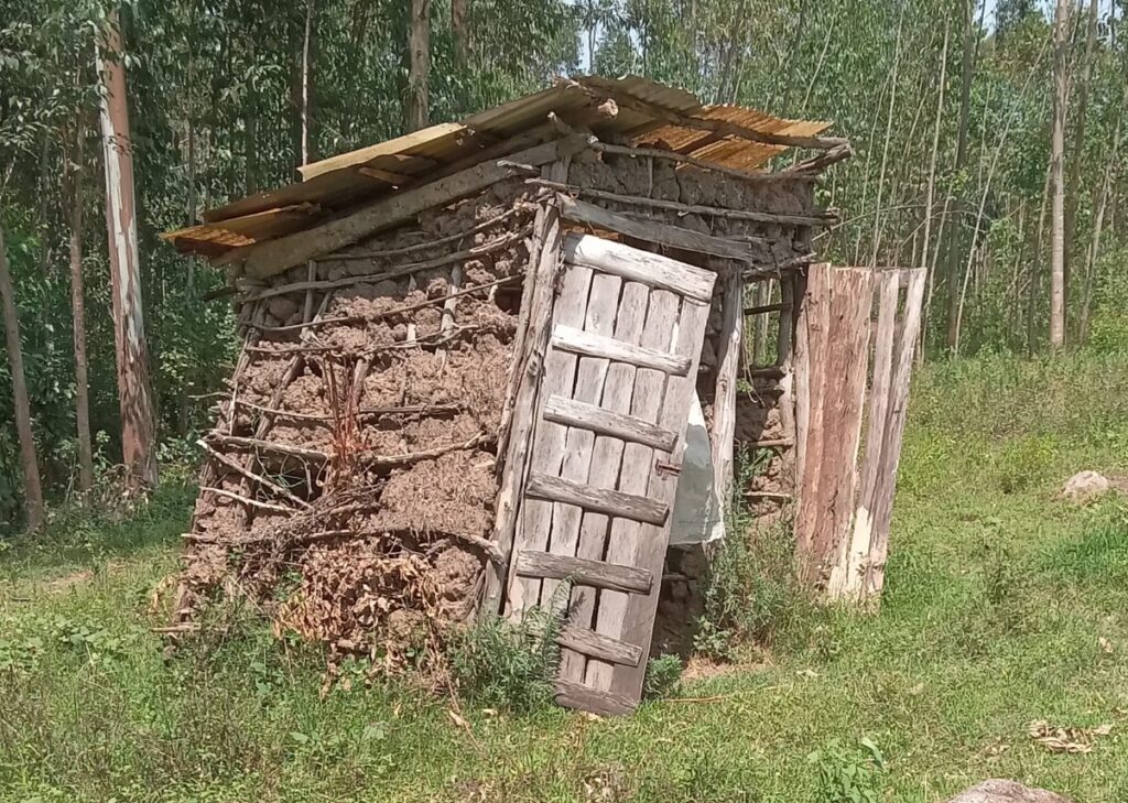 Pit latrine in bad state still in use as there is no alternative but open deification